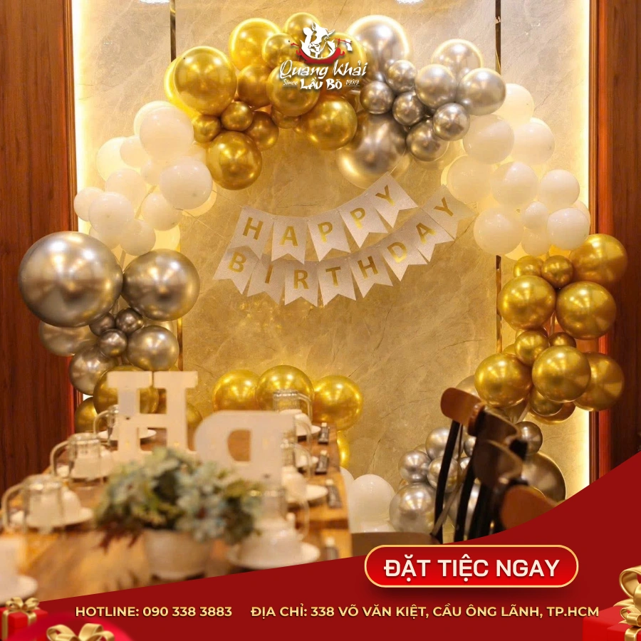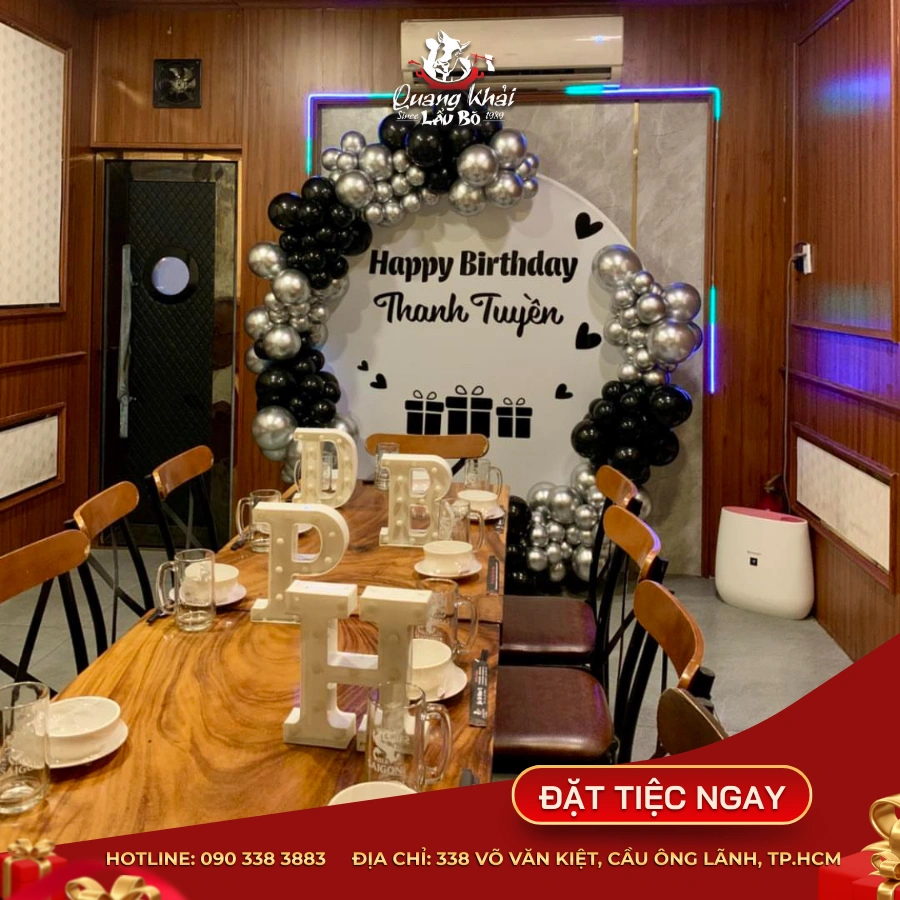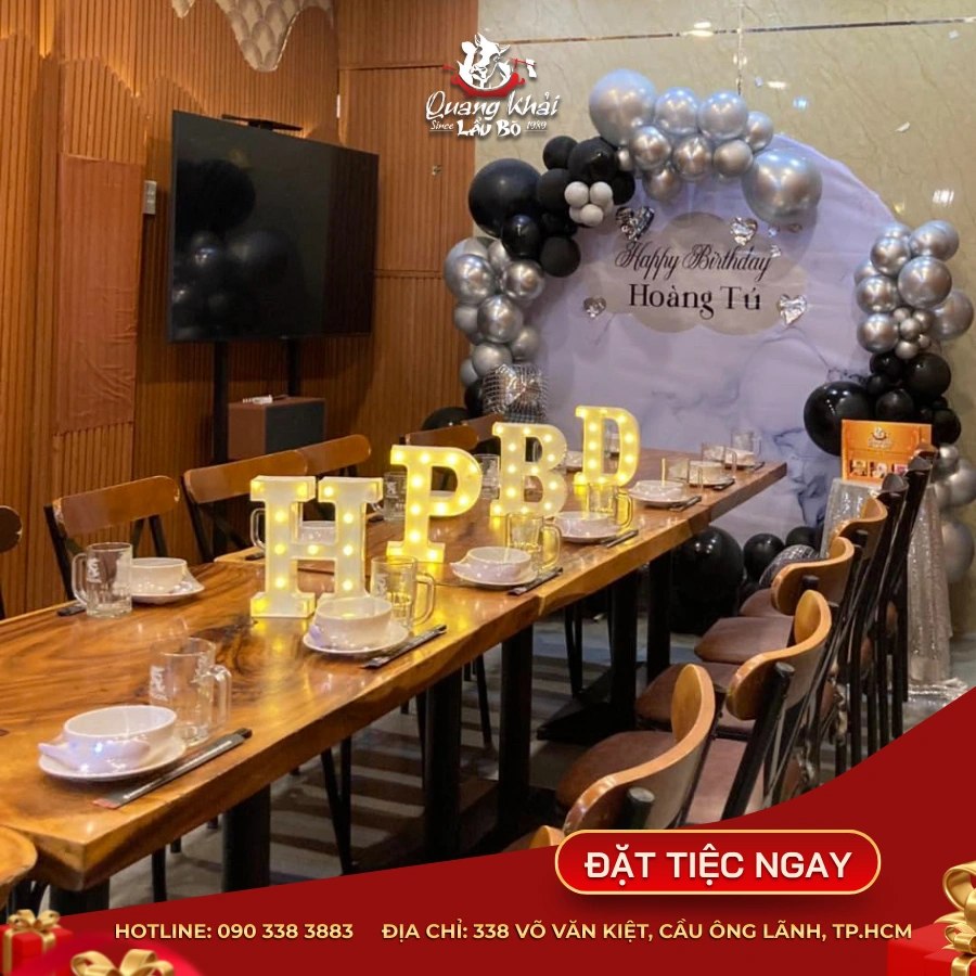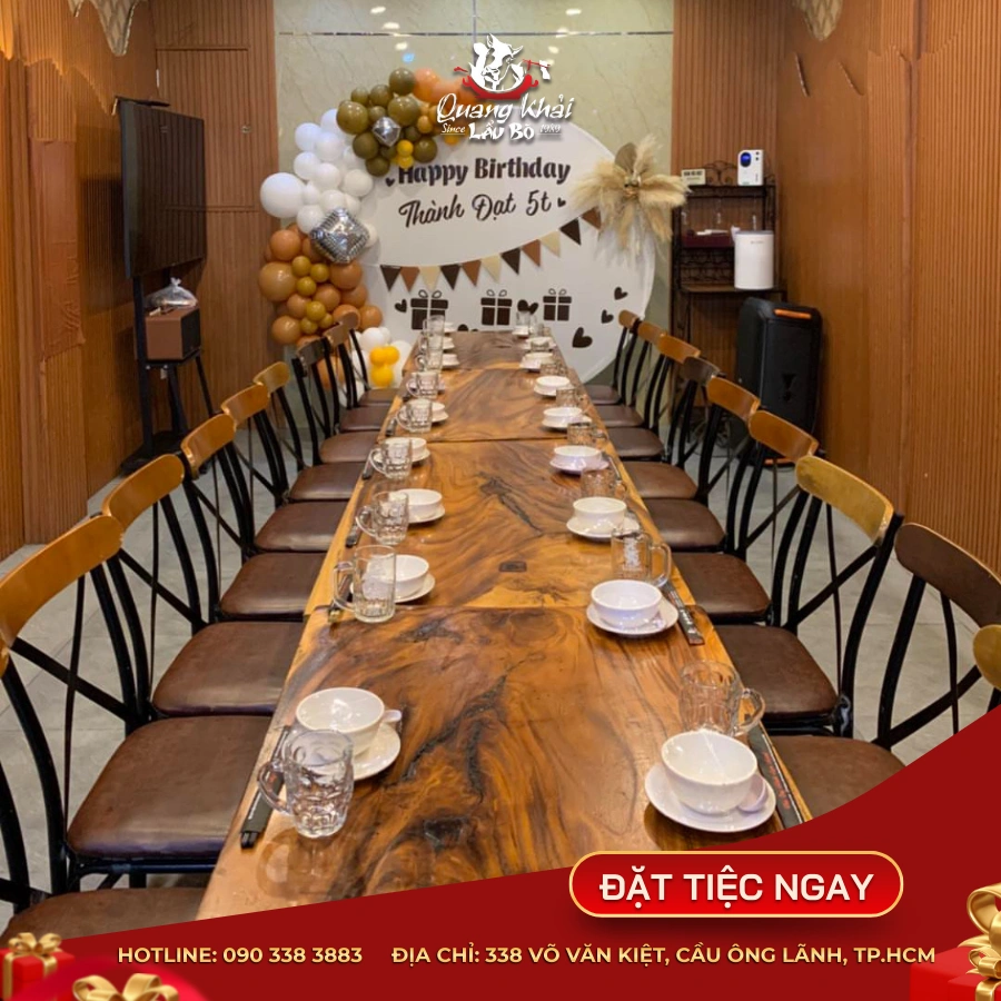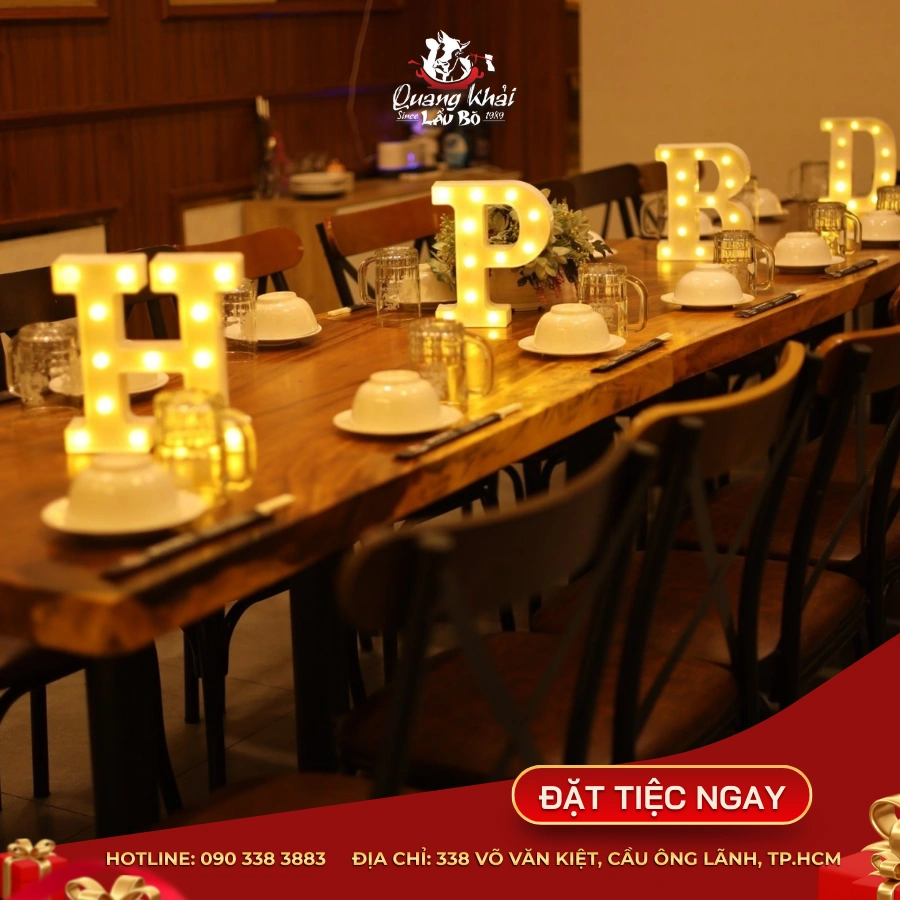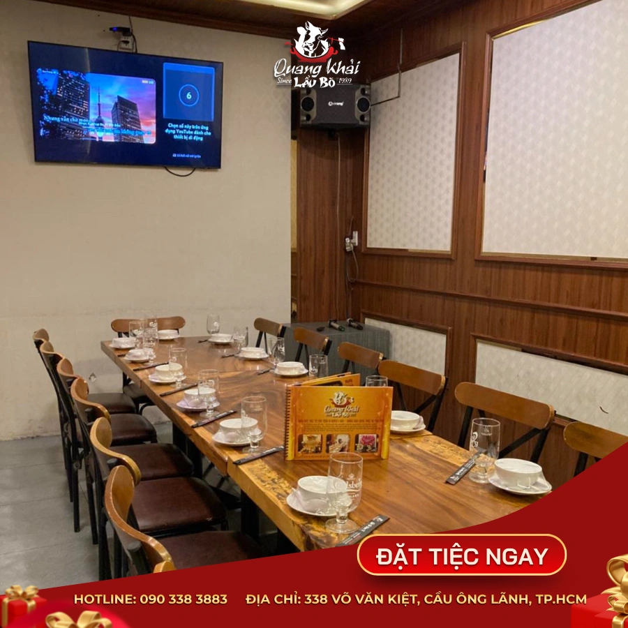 Với hơn 30 năm gắn bó cùng ẩm thực bò, Lẩu Bò Quang Khải là địa điểm quen thuộc cho những buổi tiệc sum vầy, gặp gỡ thân tình hay liên hoan ấm cúng giữa lòng Sài Gòn. Dù là tiệc gia đình, sinh nhật, họp mặt bạn bè hay tiệc công ty, Quang Khải luôn sẵn sàng chuẩn bị để mỗi bữa tiệc diễn ra trọn vẹn và thoải mái nhất.